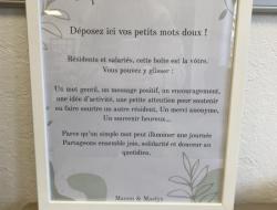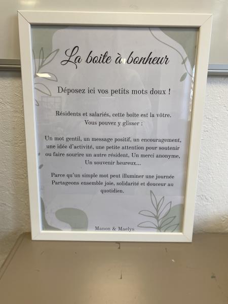 L’une des actions de ce projet est la création de « La boîte à bonheur ». Cette boîte aux lettres bienveillante, construite et décorée collectivement par les résidents, permettra d’y déposer des messages positifs, des mots d’encouragement, des idées d’activités ou encore de petites attentions destinées à soutenir un autre résident.